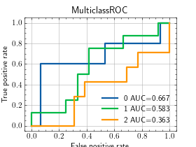 >>> from torch import randn, randint >>> from torchmetrics.classification import MulticlassROC >>> preds = randn(20, 3).softmax(dim=-1) >>> target = randint(3, (20,)) >>> metric = MulticlassROC(num_classes=3) >>> metric.update(preds, target) >>> fig_, ax_ = metric.plot(score=True)