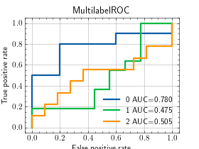>>> from torch import rand, randint >>> from torchmetrics.classification import MultilabelROC >>> preds = rand(20, 3) >>> target = randint(2, (20,3)) >>> metric = MultilabelROC(num_labels=3) >>> metric.update(preds, target) >>> fig_, ax_ = metric.plot(score=True)