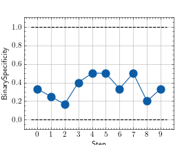 >>> from torch import rand, randint >>> # Example plotting multiple values >>> from torchmetrics.classification import BinarySpecificity >>> metric = BinarySpecificity() >>> values = [ ] >>> for _ in range(10): ... values.append(metric(rand(10), randint(2,(10,)))) >>> fig_, ax_ = metric.plot(values)