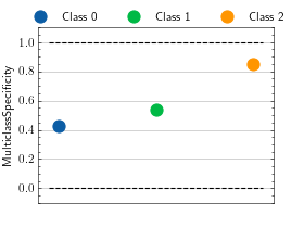 \[\text{Specificity} = \frac{\text{TN}}{\text{TN} + \text{FP}}\]Where \(\text{TN}\) and \(\text{FP}\) represent the number of true negatives and false positives respectively. The metric is only proper defined when \(\text{TN} + \text{FP} \neq 0\). If this case is encountered for any class, the metric for that class will be set to 0 and the overall metric may therefore be affected in turn.
