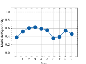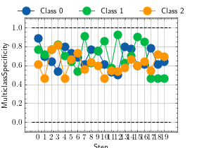 >>> from torch import rand, randint >>> # Example plotting multiple values >>> from torchmetrics.classification import MultilabelSpecificity >>> metric = MultilabelSpecificity(num_labels=3) >>> values = [ ] >>> for _ in range(10): ... values.append(metric(randint(2, (20, 3)), randint(2, (20, 3)))) >>> fig_, ax_ = metric.plot(values)