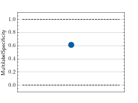 >>> from torch import tensor >>> from torchmetrics.classification import MultilabelSpecificity >>> target = tensor([[0, 1, 0], [1, 0, 1]]) >>> preds = tensor([[0, 0, 1], [1, 0, 1]]) >>> metric = MultilabelSpecificity(num_labels=3) >>> metric(preds, target) tensor(0.6667) >>> mls = MultilabelSpecificity(num_labels=3, average=None) >>> mls(preds, target) tensor([1., 1., 0.])