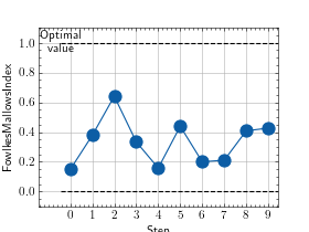 >>> # Example plotting multiple values >>> import torch >>> from torchmetrics.clustering import FowlkesMallowsIndex >>> metric = FowlkesMallowsIndex() >>> values = [ ] >>> for _ in range(10): ... values.append(metric(torch.randint(0, 4, (10,)), torch.randint(0, 4, (10,)))) >>> fig_, ax_ = metric.plot(values)