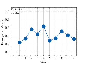>>> # Example plotting multiple values >>> import torch >>> from torchmetrics.clustering import HomogeneityScore >>> metric = HomogeneityScore() >>> values = [ ] >>> for _ in range(10): ... values.append(metric(torch.randint(0, 4, (10,)), torch.randint(0, 4, (10,)))) >>> fig_, ax_ = metric.plot(values)